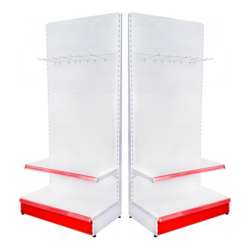 El estante está provisto de paneles perforados para permitir la disposición de los ganchos.